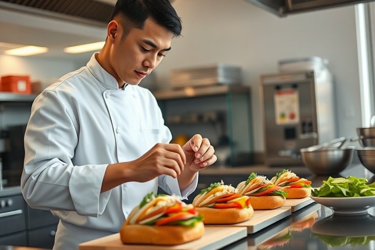 Tất cả xe bánh mì và khu bếp đều tuân thủ nghiêm ngặt các quy trình vệ sinh an toàn thực phẩm, đảm bảo môi trường chế biến sạch sẽ và an toàn.